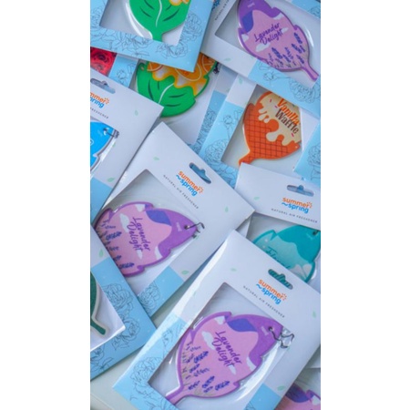 Pengharum Summerspring Leaf dirackin khusus dengan aroma bunga dan dedaunan pilihan, menggunakan bahan yang soft Keunggulan:1. Berbahan padat, sehingga tidak akan menumpahkan cairan saat digantung2. Cocok untuk mobil berkapasitas besar, wangi bisa tercium sampai ke belakang3. Bisa digunakan bukan hanya di ruang kecil seperti kamar mandi, namun cocok juga untuk ruangan ukuran sedang4. PRAKTIS! Tinggal gantung dan wangi menyebar selama 2 mingguPilihan Aroma:1. Lavender Delight2. Sparkling Woods3. Cappucino4. Vanilla Waffle5. Floral Valley6. Rose Blossom7. Blue Ice8. Orange
