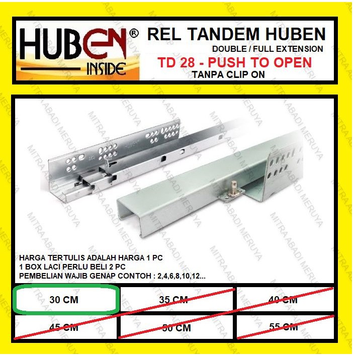HARGA TERTERA ADALAH HARGA 1 PC1 BOX LACI PERLU 2 PCSPEMBELIAN WAJIB JUMLAH GENAP (CTH: 2,4,6,8,.....)JIKA TIDAK DALAM JUMLAH GENAP, MAKA AKAN KIRIM JUMLAH GENAP PEMBULATAN KEBAWAH. LALU, KEMBALI UANG VIA SISTEM.HARGA TERBAIK DISTRIBUTOR HUBEN RESMIREL LACI TANEM HUBEN TD-28PUSH OPEN / PUSH TO OPENFULL EXTENSION / D