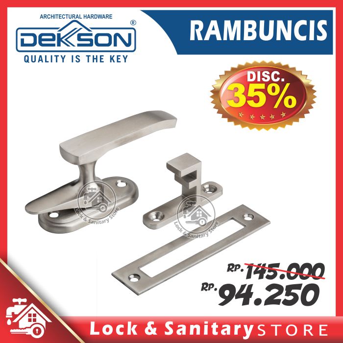Deskripsi : Rambuncis / Pengunci jendela Dekson / DekksonKegunaan : digunakan untuk pengunci jendelaMerk : Dekson / DekksonNomor Produk / Type : DKS 103 SSMaterial : Stainless SteelFinishing / Warna : SSSatuan : 1 PcsDapat diaplikasikan untuk jendela single maupun doubleLock & Sanitary Store Merupakan Distributor | Agen | Supplier | Toko Perlengkapan Kunci & Sanitary Ware Terlengkap dan Termurah di Surabaya. Tersedia Ukuran, Tipe, Warna, Merk & Produk Lainnya yang dapat disesuaikan dengan kebutuhan anda. Jika barang yang Anda cari tidak ada di daftar produk silahkan hubungi kami via CHAT lang