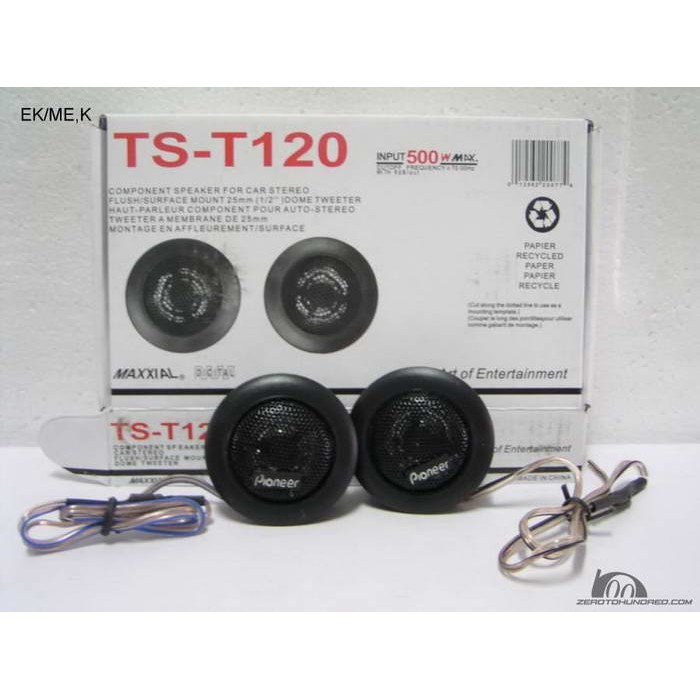 Deskripsi TWEETER MOBIL TS-T 120/TWEETER TS 120Tweeter 1.5 inch (25 mm)Speaker TS - 120 audio mobil1 set isi 2 pcsSpesifikasi:Heat Resistant voice coilNominal impedance 4 ohmMax music power nominal 200W [35 W](Cutoff frequency >= 7000Hz with 6 dB/oct.)Frequency response 2500 - 25000 HzGrille material: steel net, heat proof